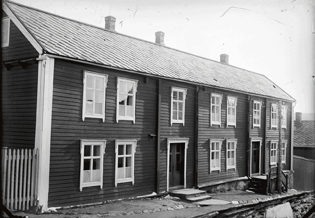 Skolebygningen som ble satt opp 1799, var en gave fra jomfru Catharina Borchgrevink. Bygget kom til å huse allmueskolen, middelskolen og realskolen i over 150 år. Huset kalles Raukassa. Bildet er tatt av Iver Olsen.