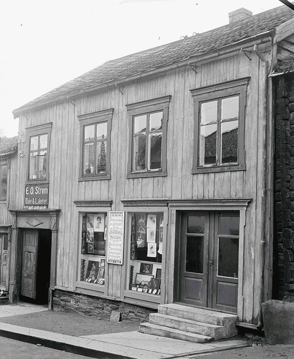 Forretningsgård i Litjgata 38 drevet av E.O. Strøm Maler og Lakerer (står på skilt over portsjælet). På skiltet mellom vinduene står det: Indramning av Billeder. Skildtmaling. Tapetsering. Indlægning av Vinduesglas. Fotografert av Iver Olsen. Bildet er utlånt av Rørosmuseet.