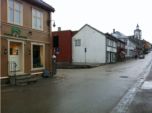 Animasjon av hvordan plattingen så ut, før og nå… Det foregår en diskusjon om dette “hullet” i Litjgata skal tettes igjen, eller om det skal fungere som en møteplass. Førbildet er utlånt av Rørosmuseet.