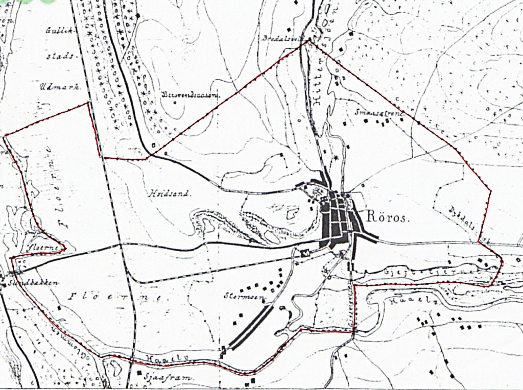 Den røde streken på kartet fra slutten av 1800-tallet markerer området som ble kalt Bergstadens sameie, tidligere omtalt som «den frie bergplass». Innafor dette området hadde bergstadens innbyggere rett til vederlagsfritt å ta seg tomt til husvære, grashaga og torvtak. Denne rettigheten falt bort rundt år 1900. I Verkets første tid var det bare en leilending i bergstaden, Hans Olsen Aasen, som fra gammalt var bygselmann under Kongen.