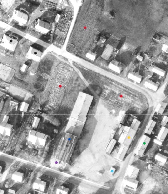 Oversiktsbildet viser hvordan Stevnehallområdet så ut i 1949. Røde prikker markerer tufter etter tyskerbrakker. Blå prikk = Stevnehallen. Gul prikk = Vonheim. Grønn prikk = Losjelokalet. Lyseblå prikk = Drosjesentralen. Lilla prikk = Offentlig toalett.